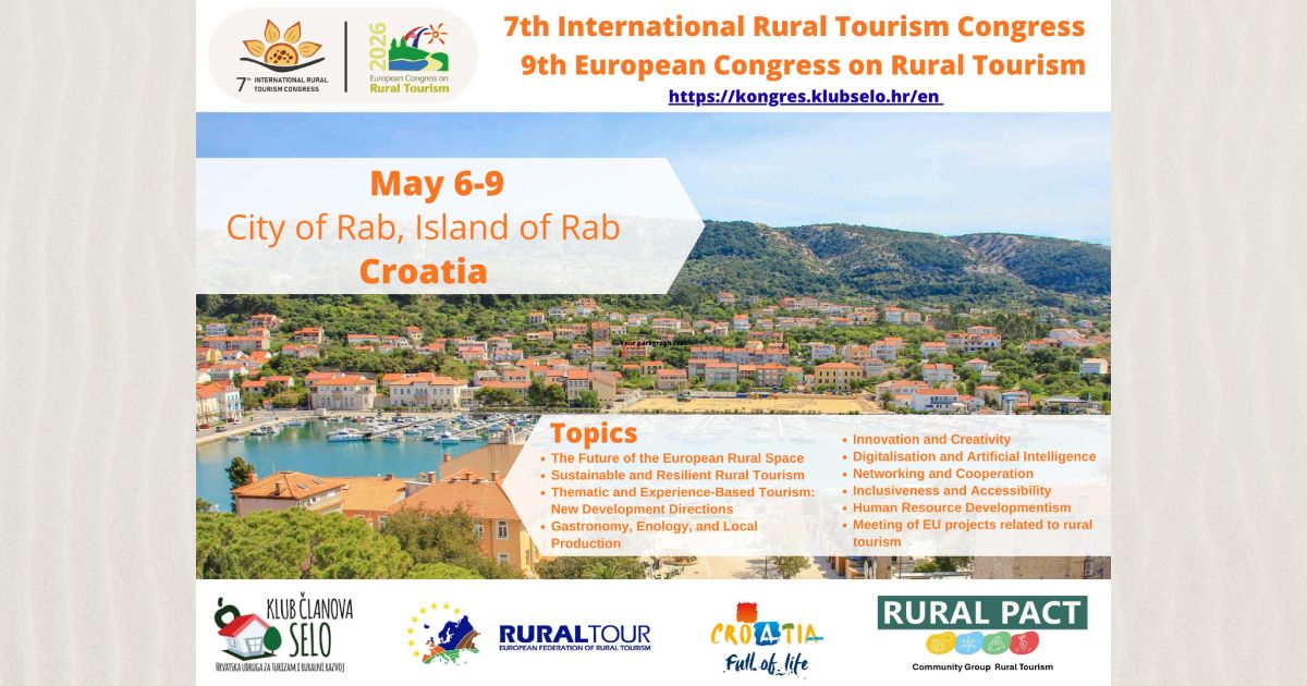 Hrvatska udruga za turizam i ruralni razvoj „Klub članova Selo“, u suradnji s organizatorima, s velikim zadovoljstvom ugošćuje brojne znanstvenike i stručnjake iz područja održivoga ruralnog turizma. Kongres će se održati od 6. do 9. svibnja 2026. godine u gradu Rabu.
